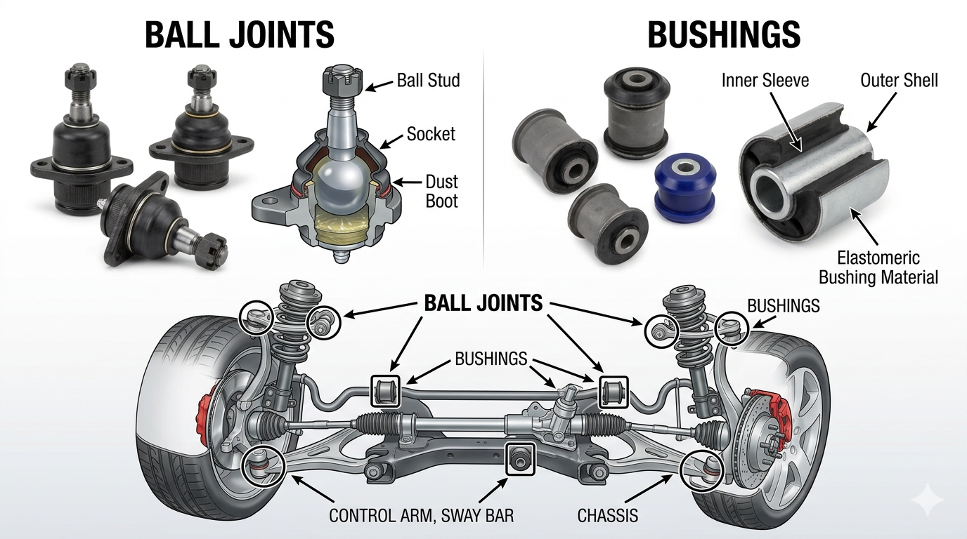 An takeaway praiticiúil: iniúchadh hailt liathróid agus bushings ag gach rothlú boinn (gach 5,000-7,500 míle), cuir na comhpháirteanna caite ina bpéirí acastóra in ionad, lean an obair fionraí i gcónaí le ailíniú ceithre roth, agus roghnaigh cáilíocht na gcomhpháirteanna a oireann do chás úsáide d'fheithicle - rubair OEM do thiománaithe laethúla atá dírithe ar chompord, polúireatán le haghaidh feidhmíochta nó feidhmchláir thromshaothair.